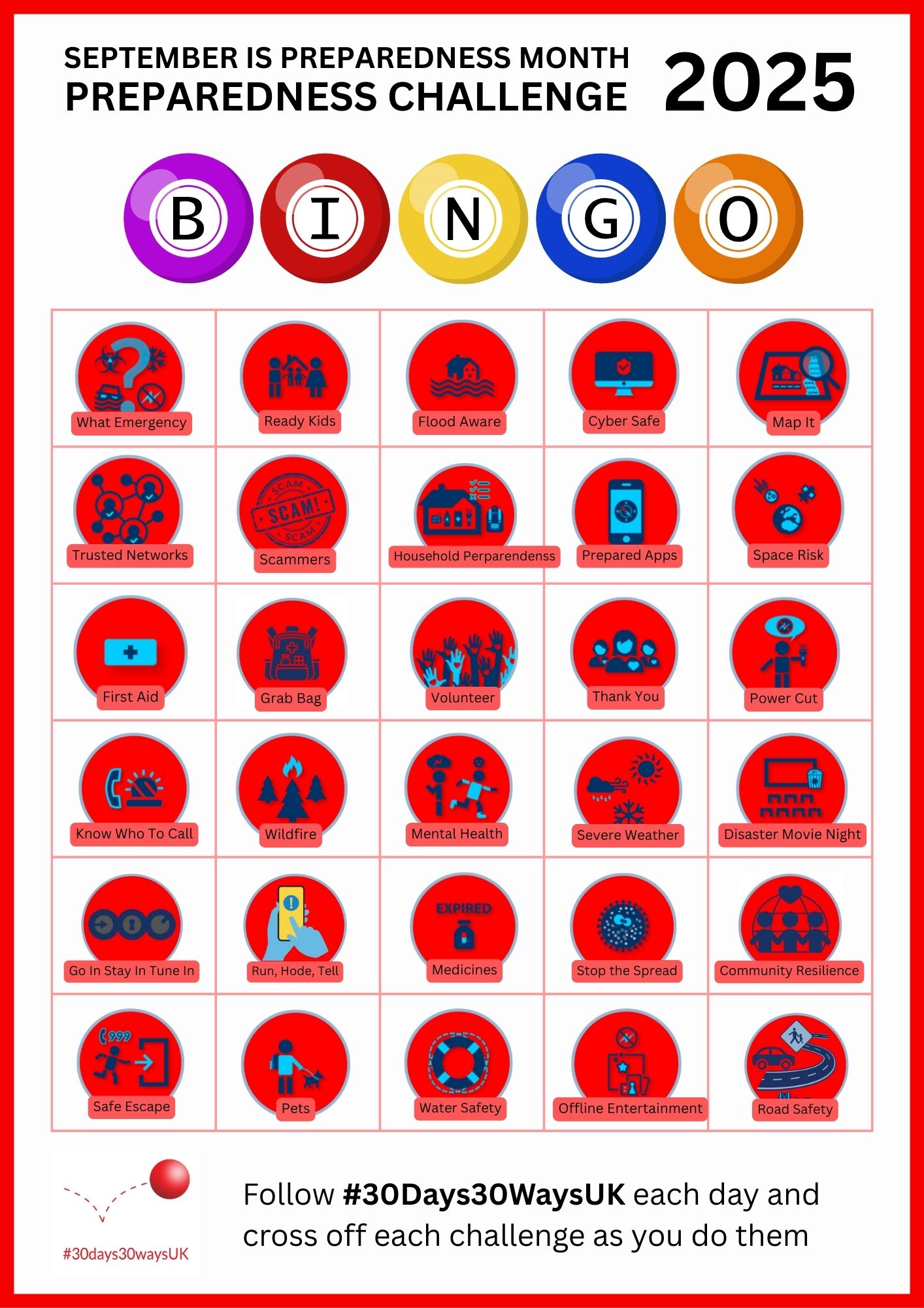 DOWLOAD the bingo PDF or JPG, available from August. Each daily #30days30waysUK topic has a corresponding icon to cross off. That way it is easy and fun to keep track of your personal preparedness progress. All 30 days completed? BINGO